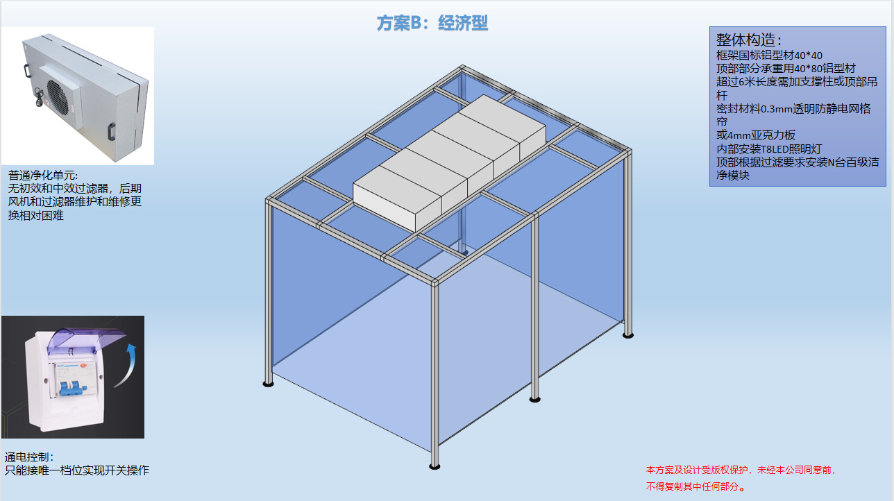 燈具:內部采用凈化室專用凈化燈,不產塵,滿足潔凈棚內的照明需求。